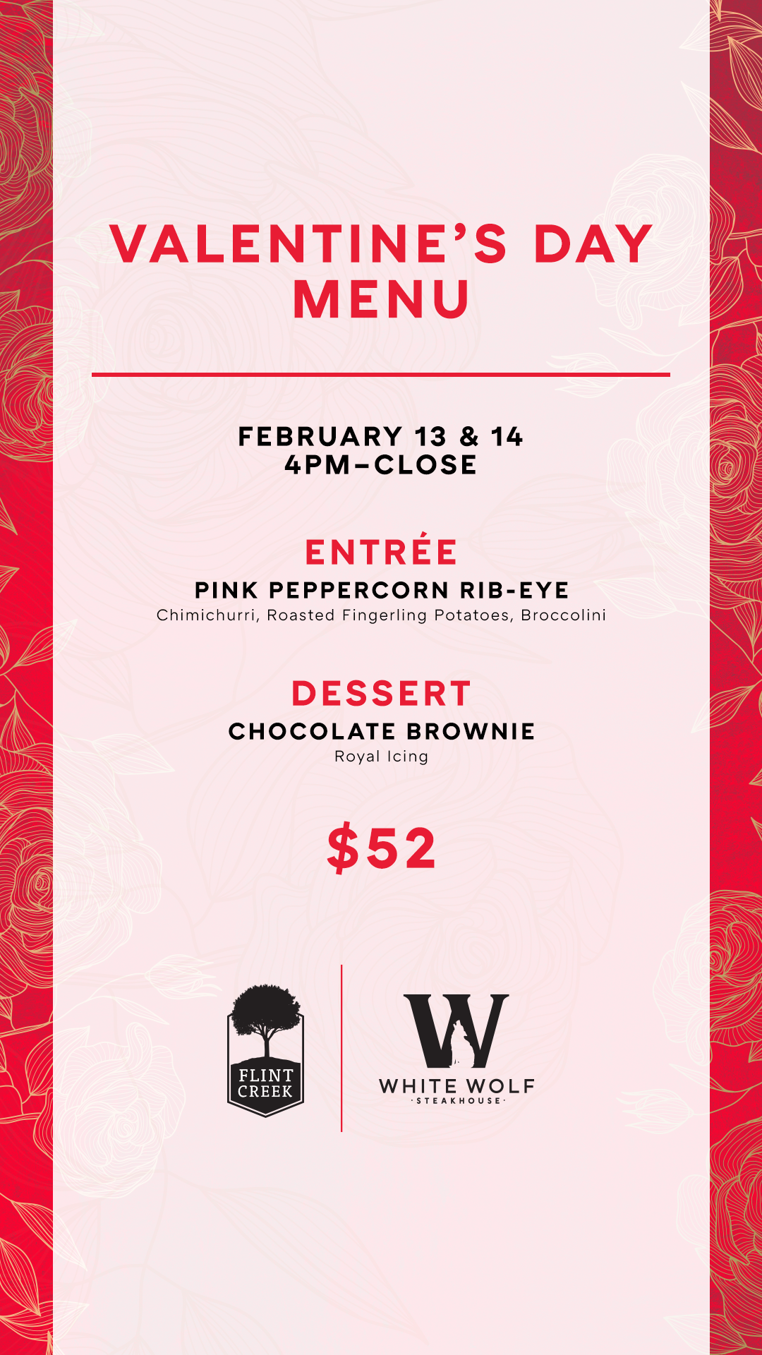 Make it a Valentine's Day to remember at White Wolf Steakhouse & Flint Creek Steakhouse!